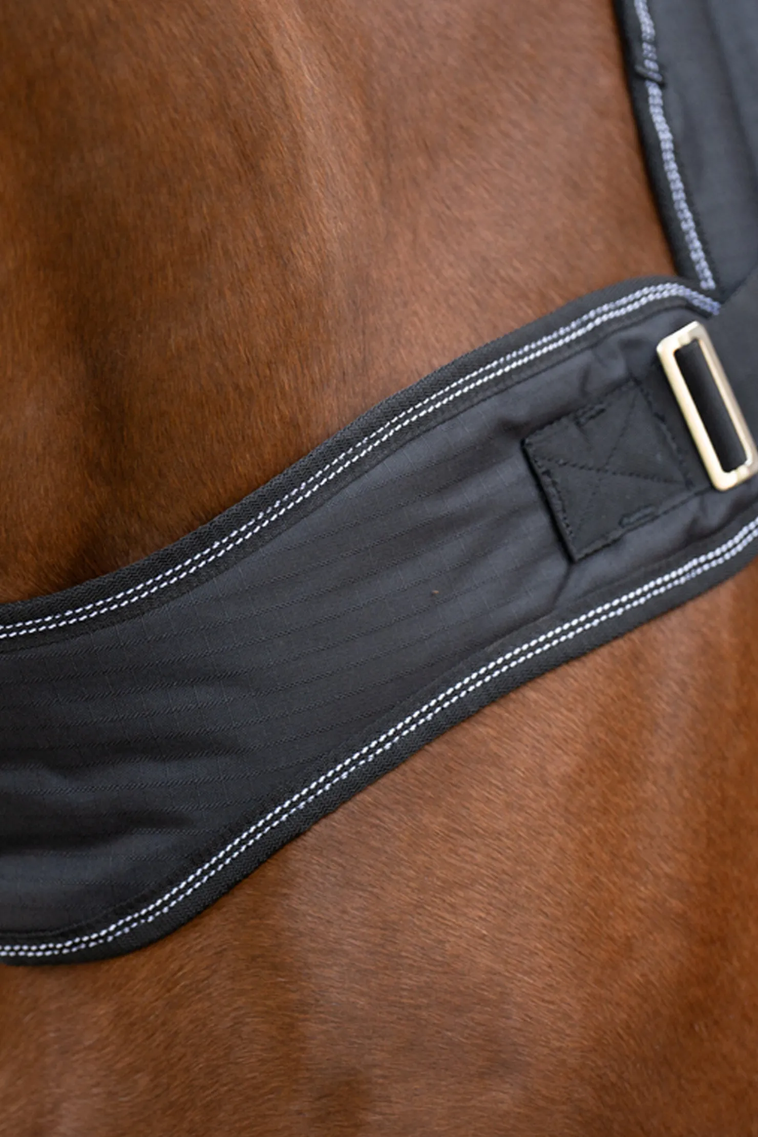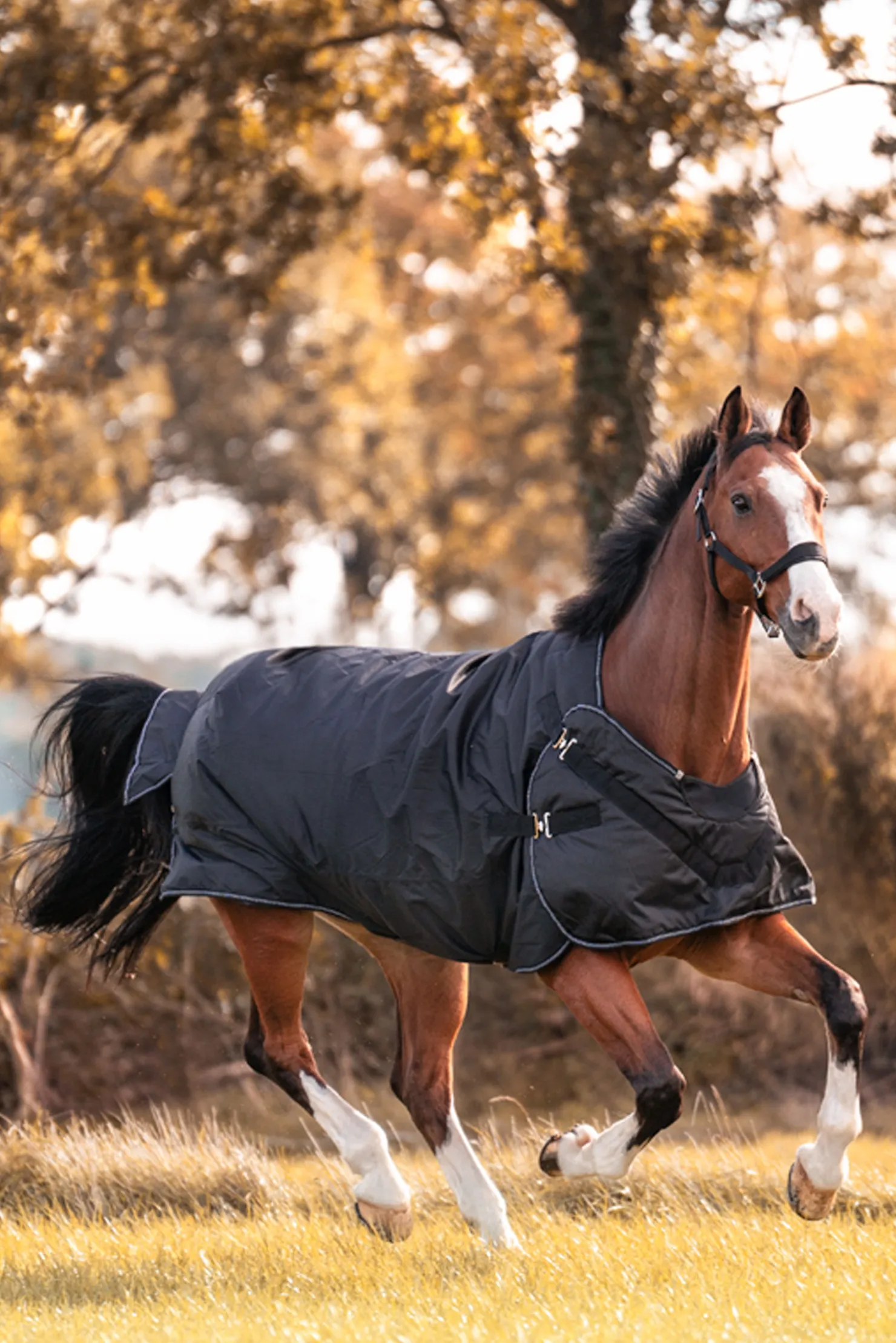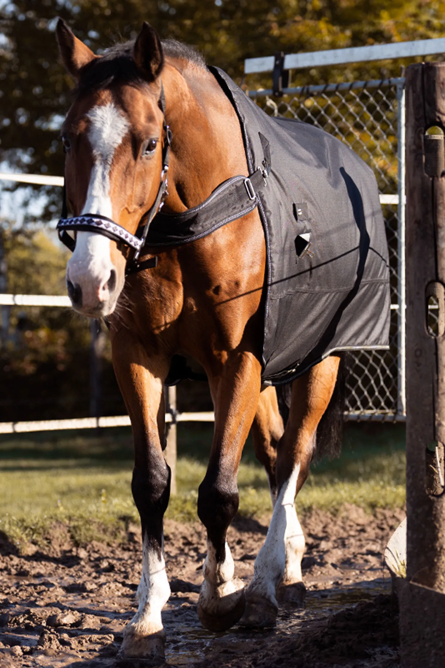 Takket være den raske og enkle utskiftingen av bryststroppen kan teppet Halifax brukes både som utedekken og som walker-dekken (utendørs). Det er to festemuligheter for bryststroppen: Den nedre festingen er spesielt egnet for smalere hester. Teppet Halifax 2-i-1 gir hesten din den bevegelsesfriheten den trenger i walker eller på løpebånd. Utedekkenet tilbyr også denne komforten: Fordi teppet ikke er lukket ved skuldrene, som det er tilfelle med vanlige utedekken, har hesten din tilstrekkelig frihet i ben og skuldre uten at teppet strekker seg ved skuldrene. Den anatomisk utformede rygglinjen med fremtredende manke, samt halefliken og den dype haleremmen, sikrer en ideell passform uten å skli. De dypere sidene på teppet Halifax 2-i-1 beskytter også det følsomme magområdet mot kulde. Polstringen ved manken og det glatte innerstoffet gir hesten din den komforten den trenger.