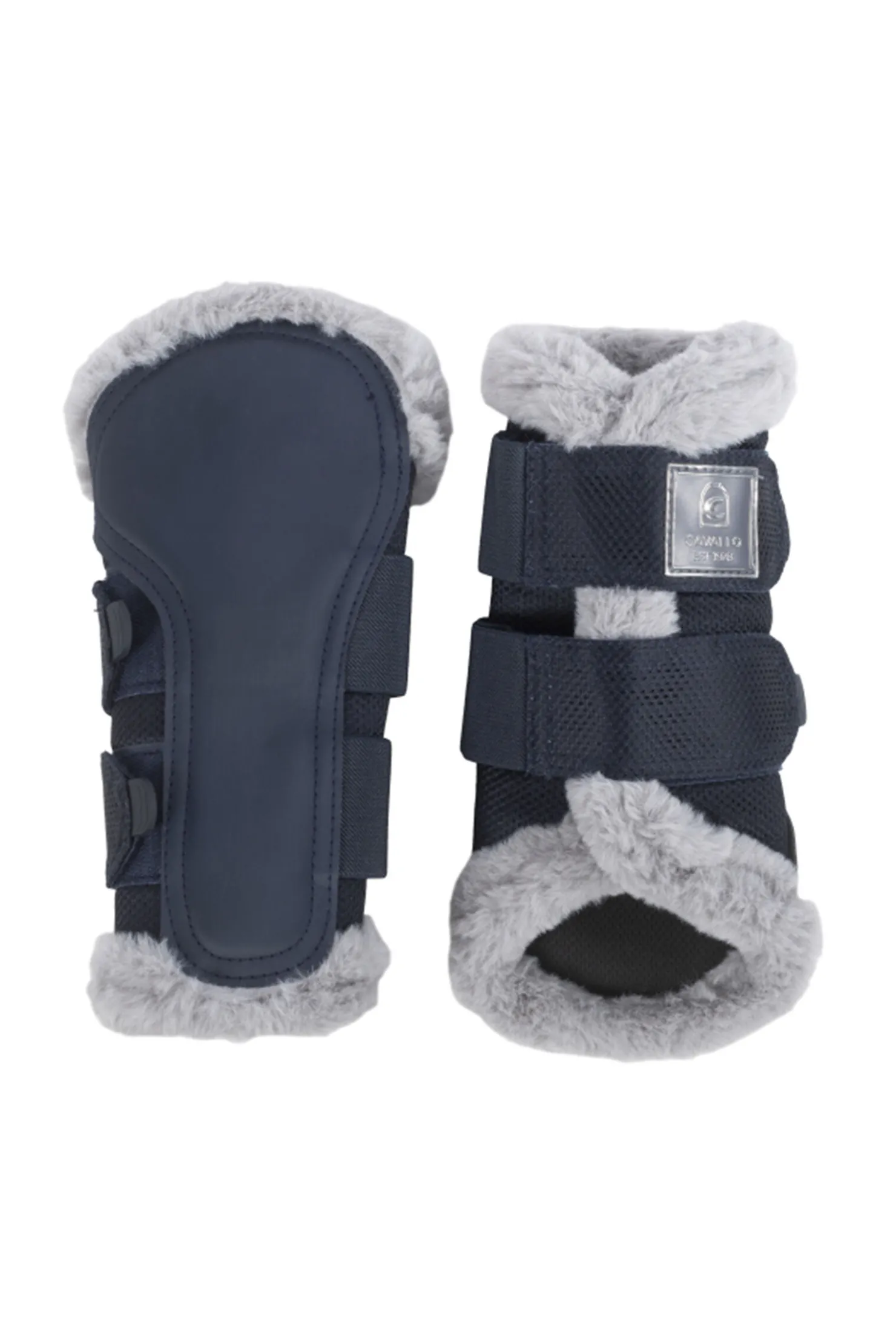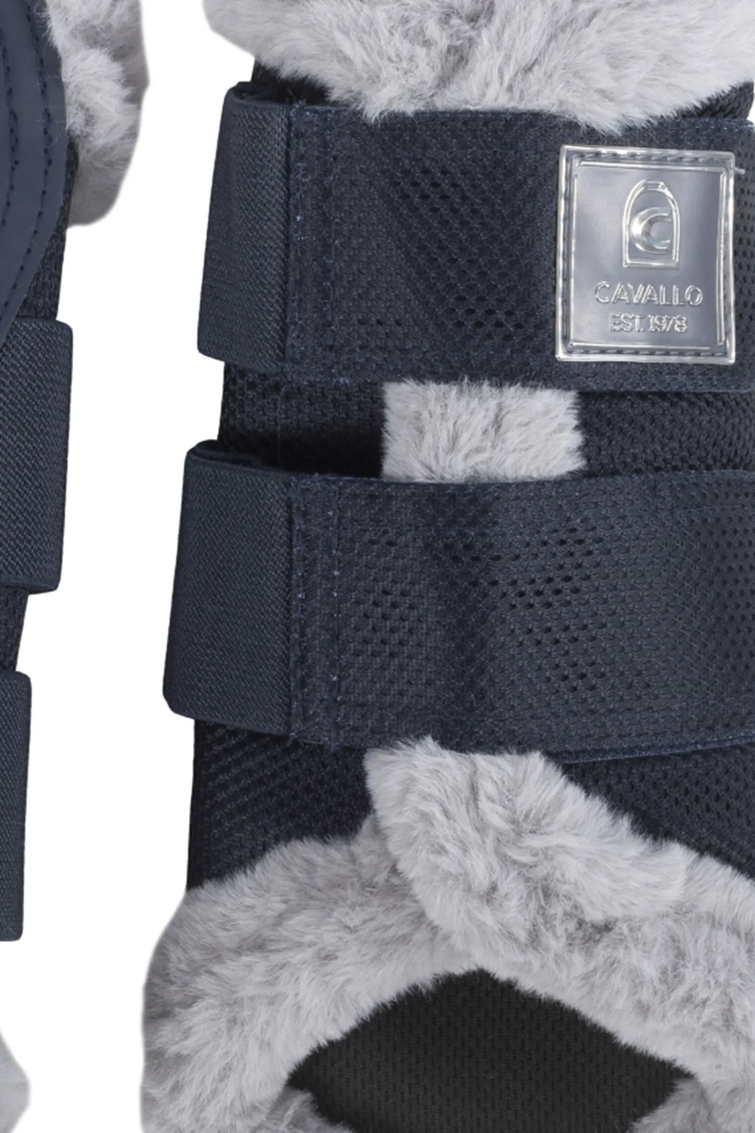 Høykvalitets gamasjer laget av mesh og imitert skinn.Innsiden av gamasjen er foret med pustende mesh.Den falske pelskanten skaper ikke bare et flott utseende, men garanterer også en høy bærekomfort.Gamasjene er utstyrt med to eller tre brede elastiske bånd og fleecetape for å lukke dem på utsiden.Borrelåsremmen er dekorert med en Cavallo-etikett.