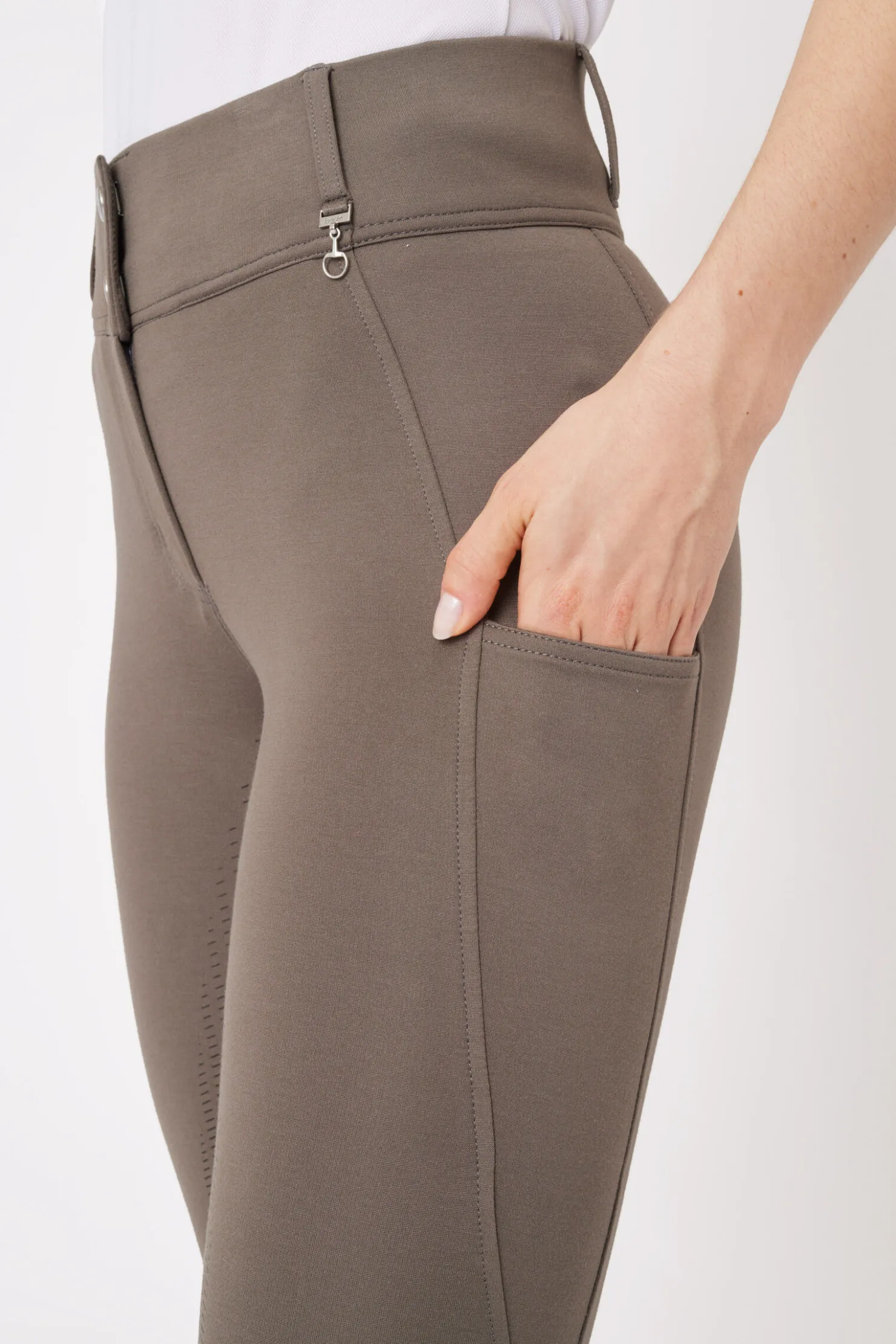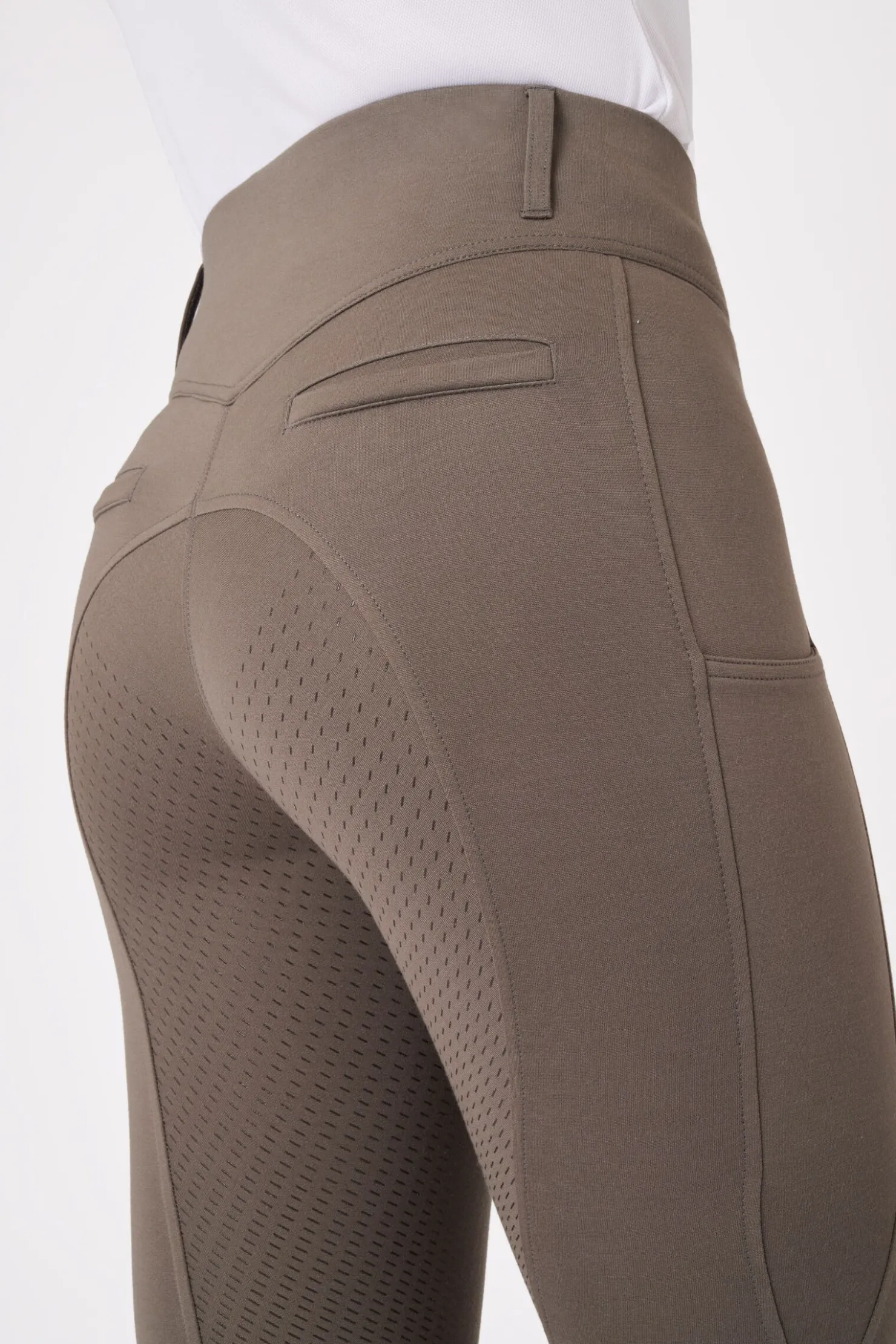 Mira helforsterkede ridebukser er perfekt til hverdagsridningen.Takket være silikongrip er det ikke behov for sømmer i kneområdet.Den brede linningen lukkes med to Gutos-knapper og har brede beltehemper slik at du kan bruke disse ridebuksene med et valgfritt belte.Uekte baklommer og en formet baksøm som gir en flatterende figur.