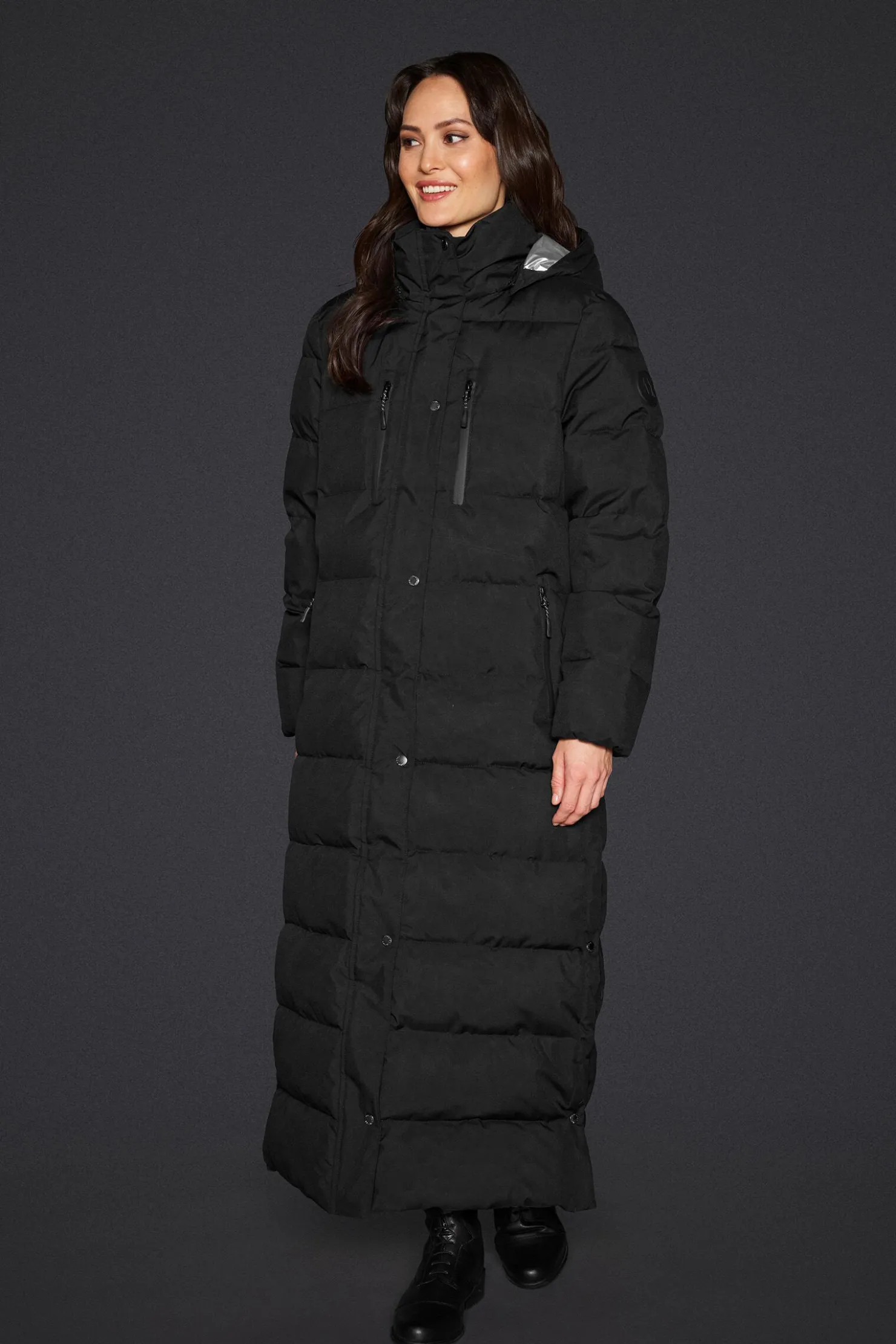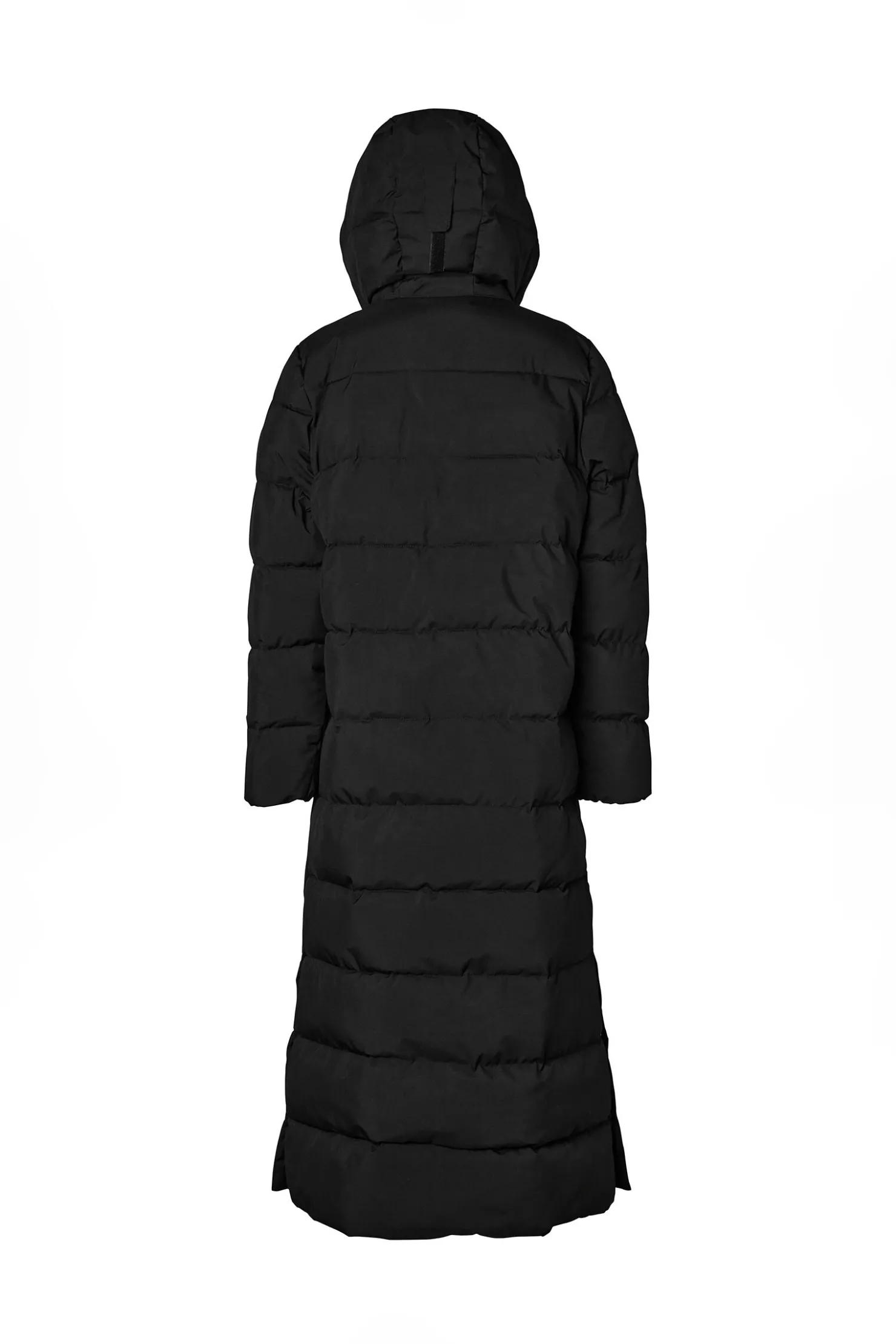 Lang, varm polstret kåpe med høye sidesplitter, gjennomtenkt designet med et iøynefallende sølvfarget innerfôr i den avtakbare hetten.