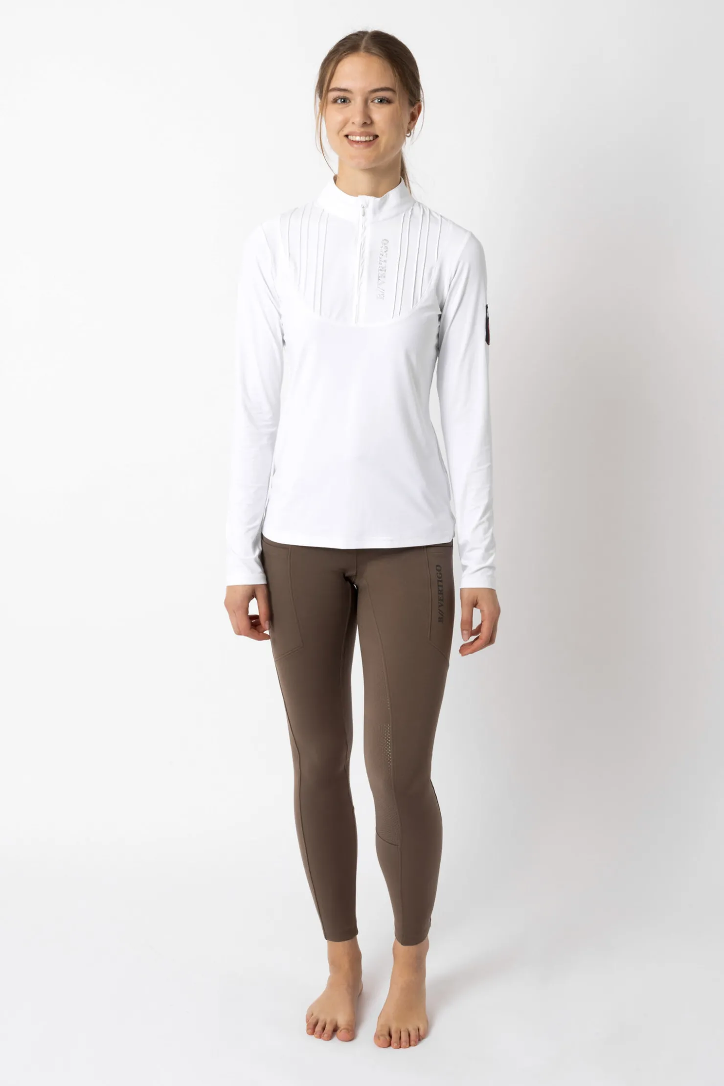 B Vertigo Demi skjorte gir deg et stilig utseende når du trener, samtidig som du får de funksjonene du trenger: stoffet er mykt og puster slik at det trekker vekk fukt.Glidelåskragen kan brukes åpen elle lukket, avhengig av ditt humør og din stil.Nydelige folder gir et sofistikert utseende.Den diskrete logoen i krystall gir et glitrende preg.Bruk den med dine favoritt B Vertigo ridebukser, og du er klar!