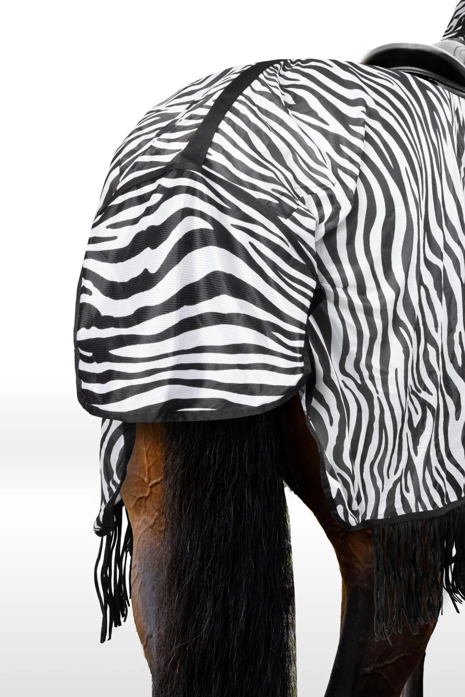 - 200 gram pustende ridedekken i mesh-stoff med sebratrykk.