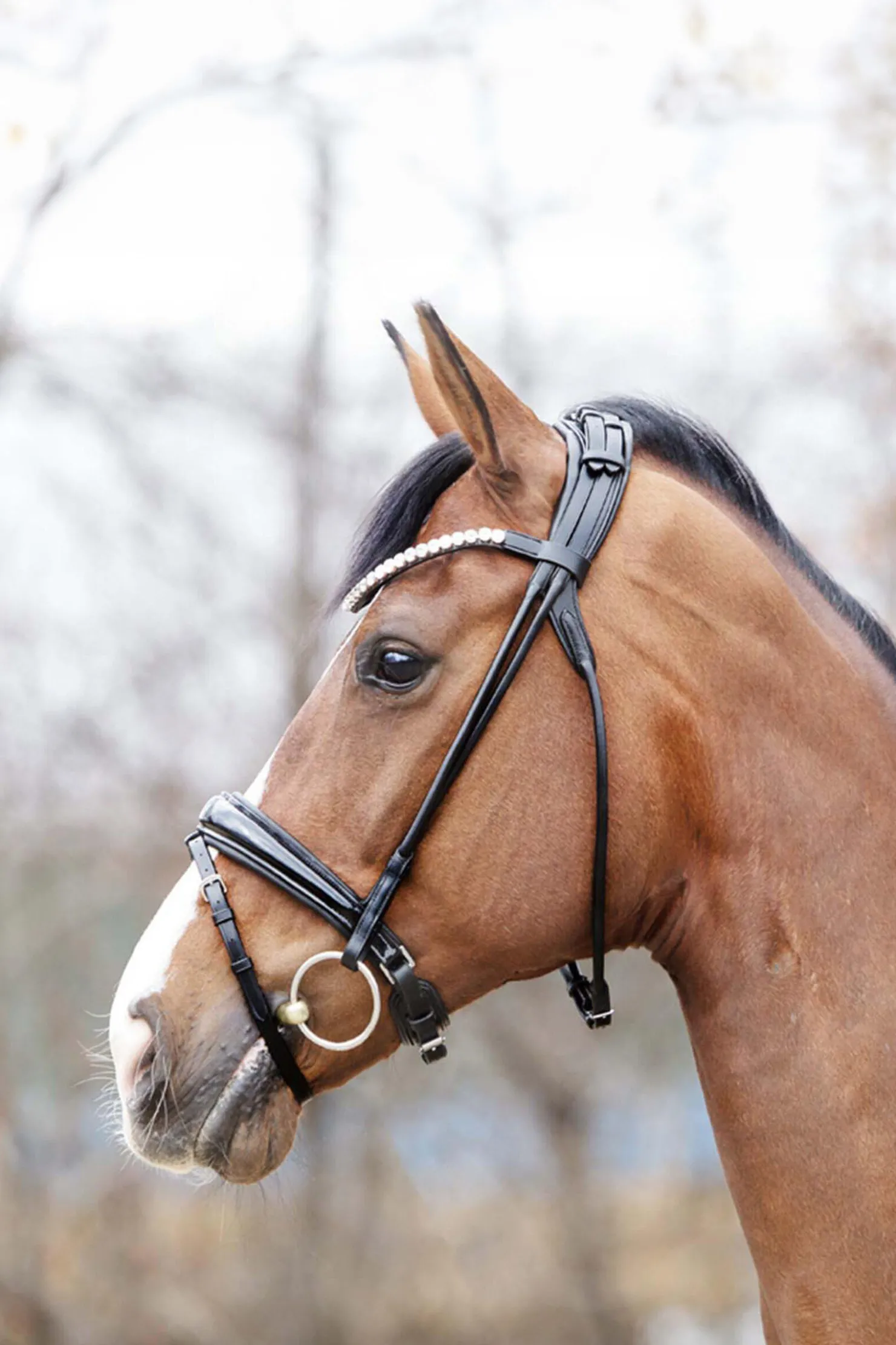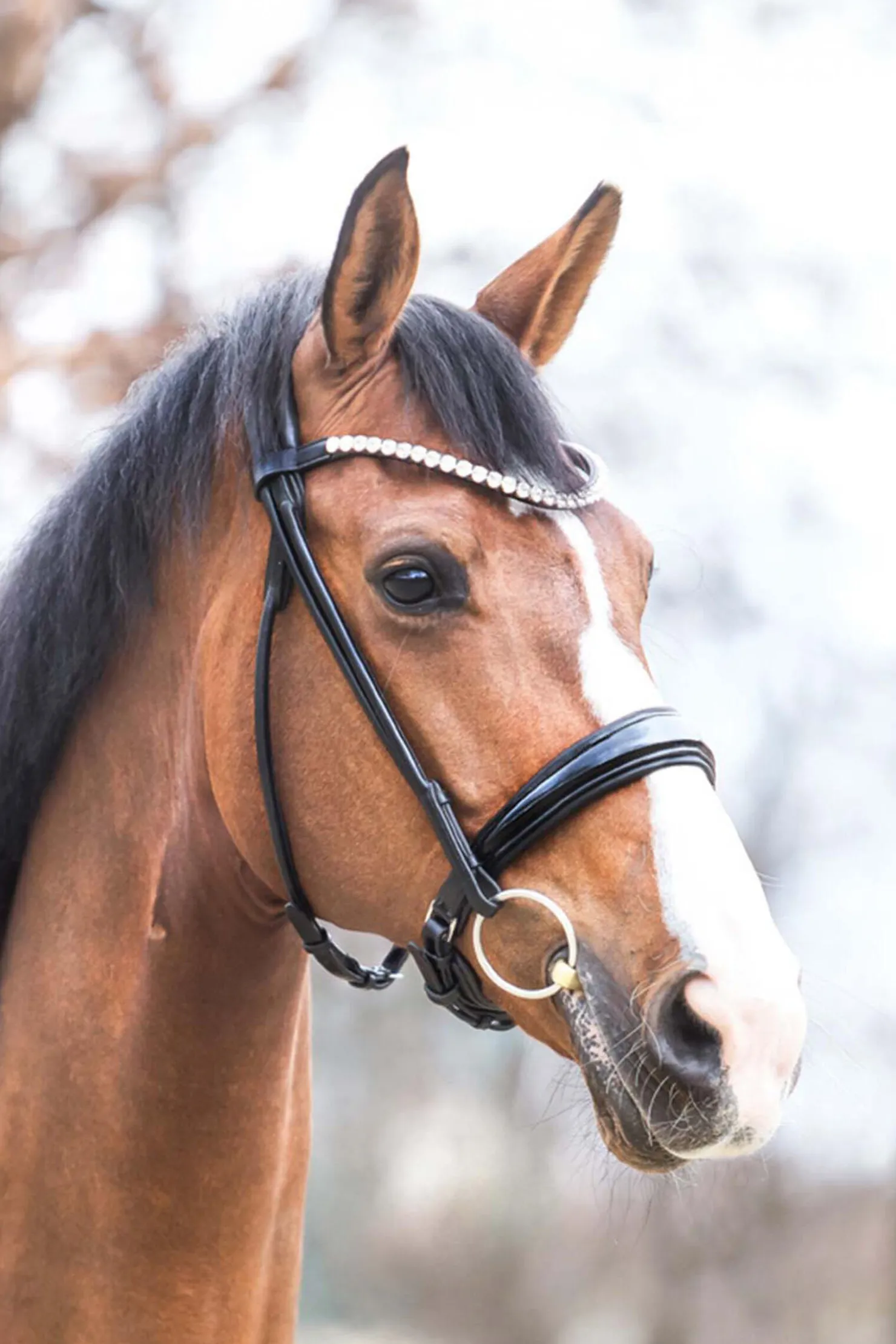 Laget av tysk lær i høy kvalitet, Florina KavalSH4 hodelag imponerer med elegansen: de rundsydde sidereimene, det buede pannebåndet med store, hvite pyntesteiner og den brede nesereimen gjør hodelaget svært unikt på hestens hode.Det anatomisk formede og fôrede nakkestykket sikrer også et høyt nivå av brukskomfort.Florina KavalSH4 hodelag kommer uten tøyler.KavalSH4 – avtakbar nedre nesereim uten synlig feste takket være KavalSH4. Festestroppen kan nemlig fjernes.Denne spesielle egenskapen gjør at holderen til den nedre nesereimen ikke er synlig, slik den er med vanlige hodelag med avtakbar nedre nesereim.I motsetning til konvensjonelle hodelag med en synlig holder for nedre nesereimen, er disse hodelagene med KavalSH4 LPO-kompatible.