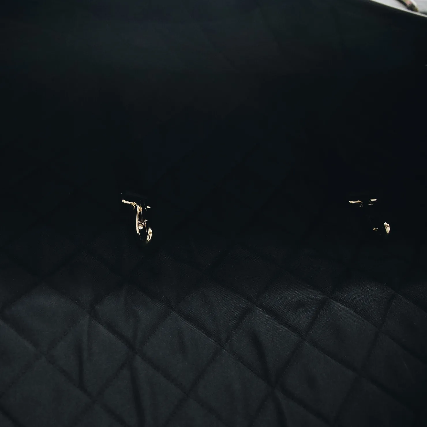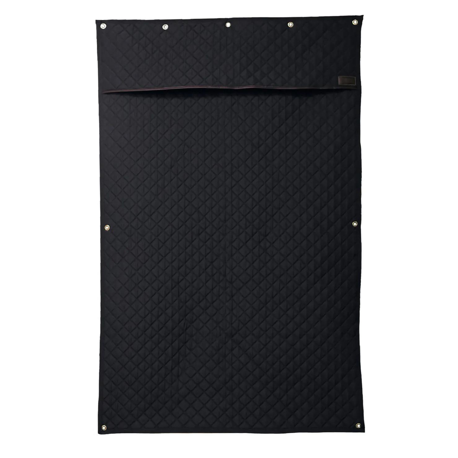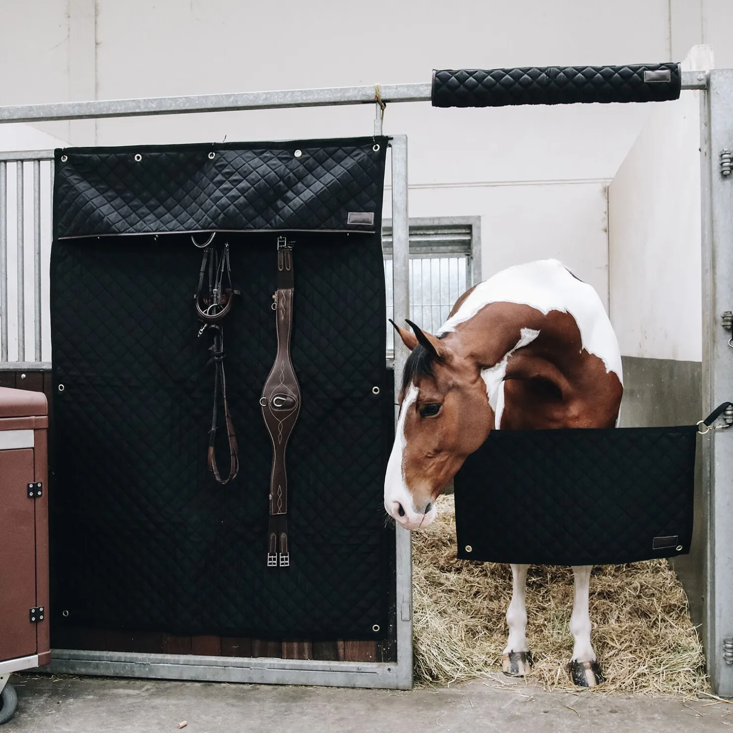 The Kentucky Stable Curtain offers your horse the well deserved rest on the show or at home. This Stable Curtain features five gold coloured, reinforced rings to attach to the stall. Under the flap are five snap hooks to attach accessories to such as bridles, rack for rugs, grooming hook,… The snap hooks are carefully put away behind the flap with artificial leather Kentucky logo so you don窶冲 see them. The Diamond Quilting Pattern, the artificial leather piping on the flap and the fancy artificial leather Kentucky logo all contribute to this fancy look. The Stable Curtain is a perfect match to our Head Protector and Stable Guard. It is made out of 600D High Tenacity Polyester and is machine washable at 30°, no dryer.