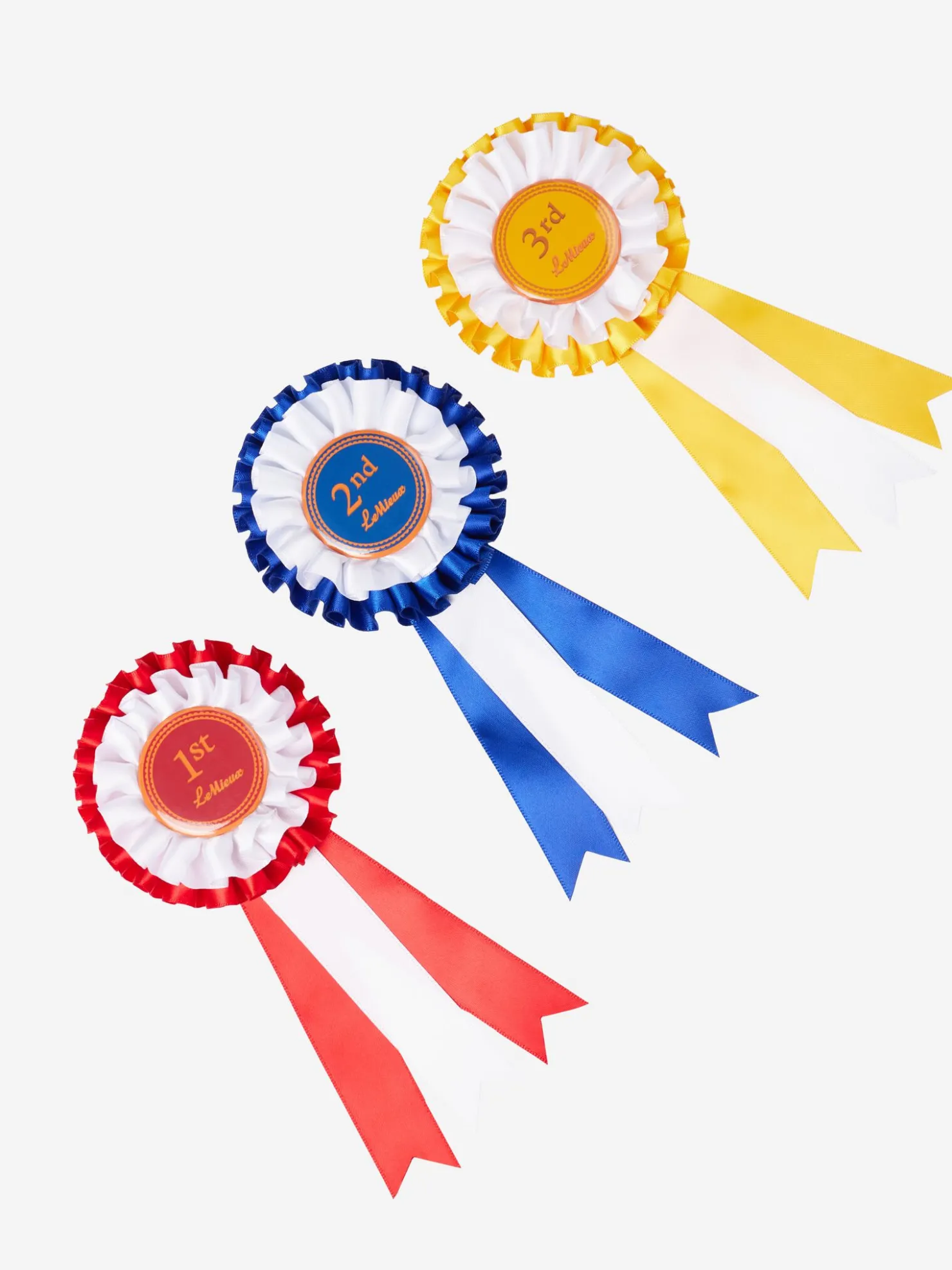 - Sett med tre sateng Hobby Horse vinnerrosetter (rød, blå, gul)