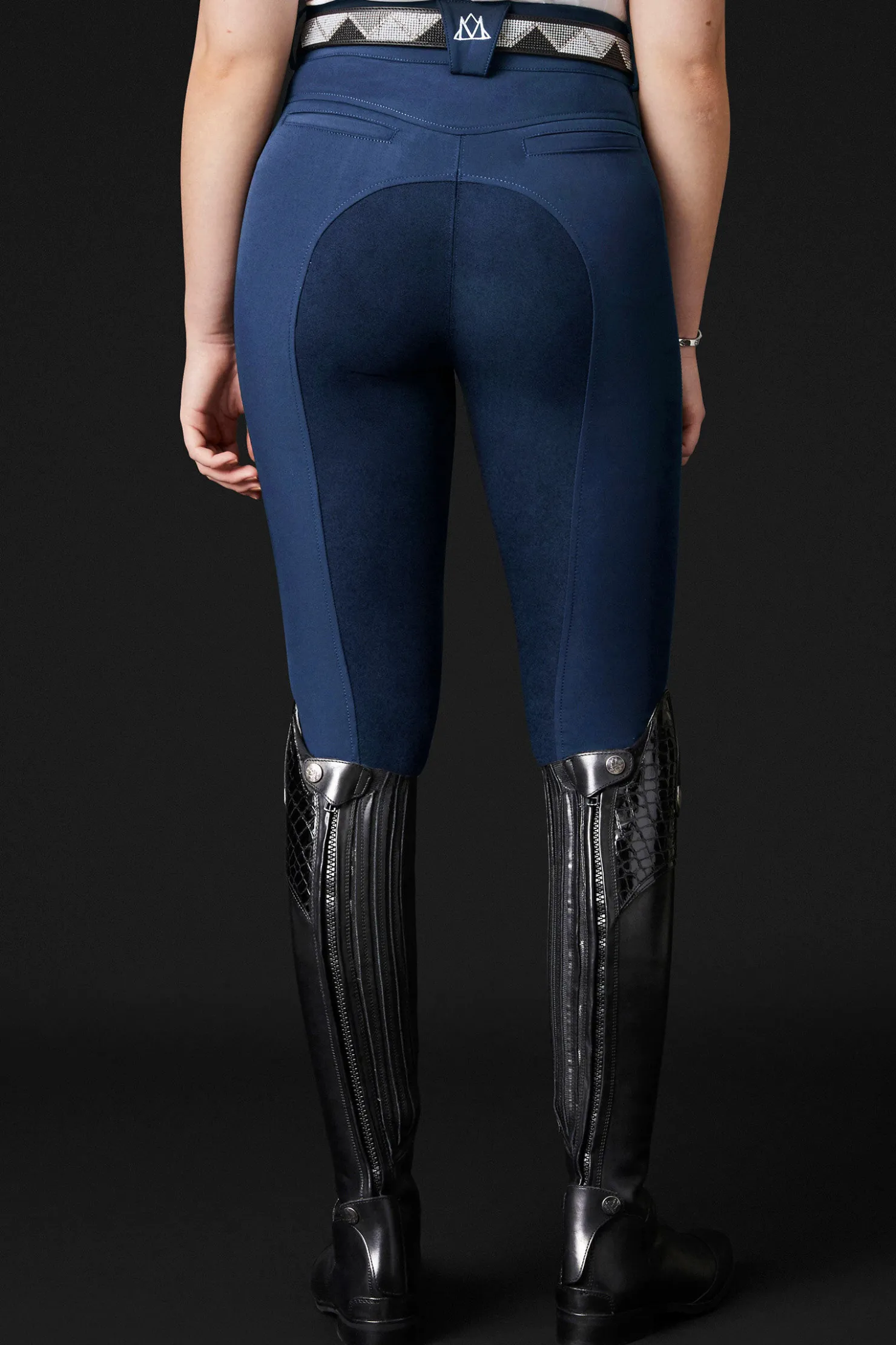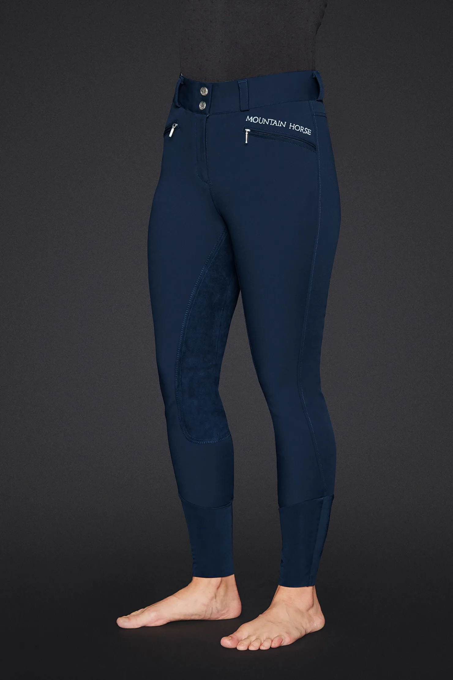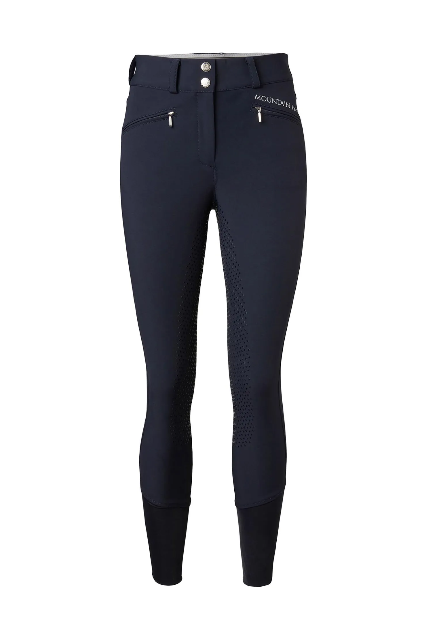 Disse høykvalitets ridebuksene til kvinner er laget av pustende stoff som transporterer fuktighet og motstår smuss og væsker. Det høye midjebåndet har dobbel krok-lukking foran, med en myk logoelastikk på innsiden for ekstra komfort. To frontlommer med glidelås og beltestropper i midjen øker funksjonaliteten. Fullsetet i Clarino gir godt grep. Den fleksible, dobbeltfoldede mansjetten nederst på benet sikrer en behagelig passform.