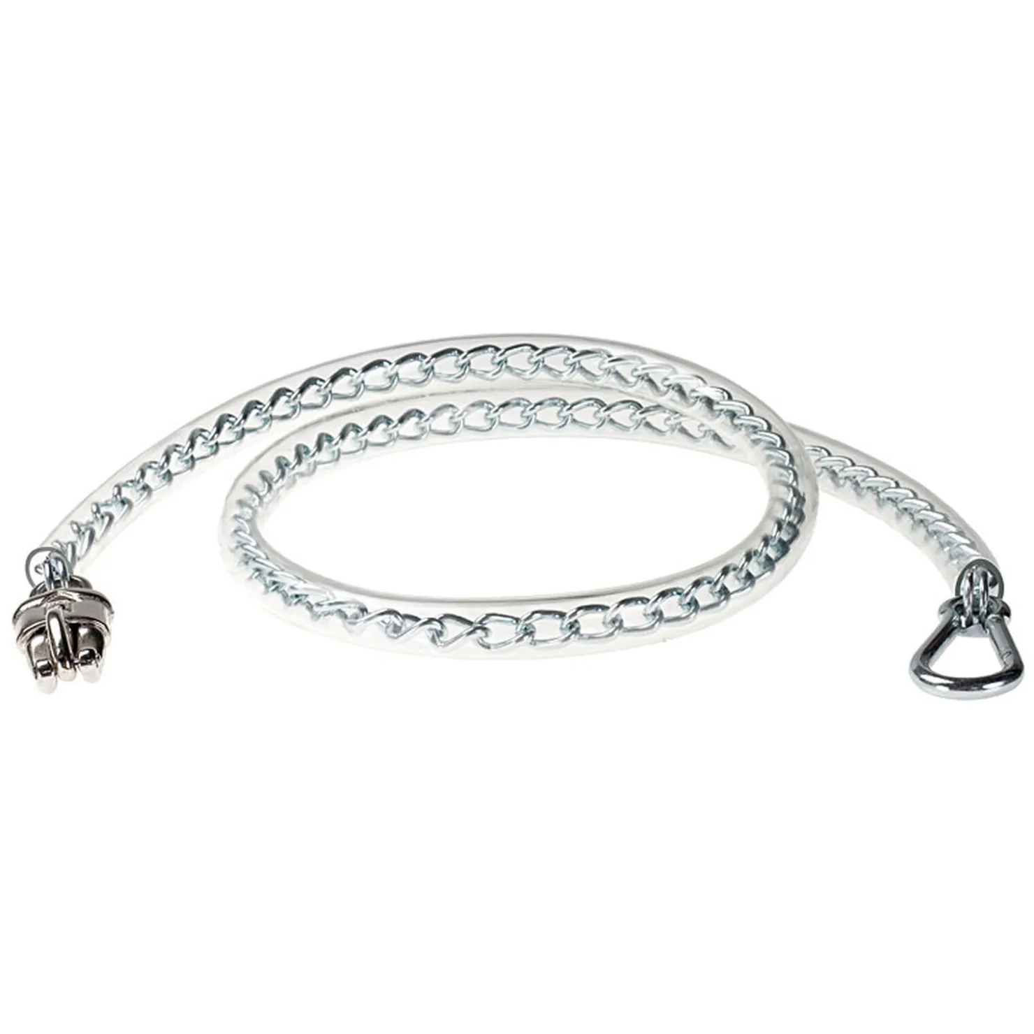 Metallkjetting med gummibelegg. Karabinkrok i den ene enden, panikkhake i den andre.