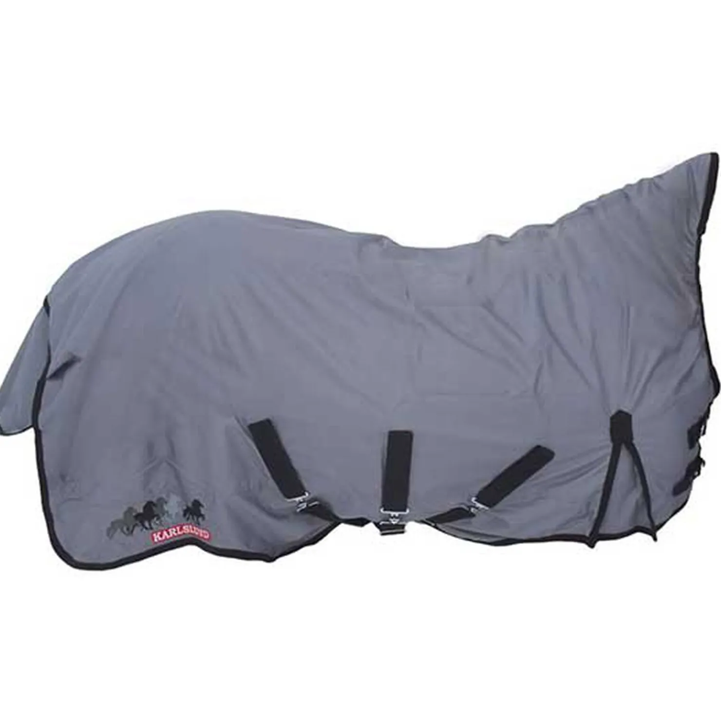 Utedekken i holdbart 600D ripstop materiale, med halv lengde på halsen. Det er vanntett og puster, med et fint fleecefôr.Dekkenet har en elastisk halsåpning, splitter på skuldere og buer for beina, for optimal fasong for hesten og god bevegelsesfrihet. Passer godt til bruk utendørs i regnver, og som utedekken.Med dobbel lukking og hurtigkroker på brystet, halelapp, elastiske beinsnorer, justerbare kryssgjorder og halesnor.