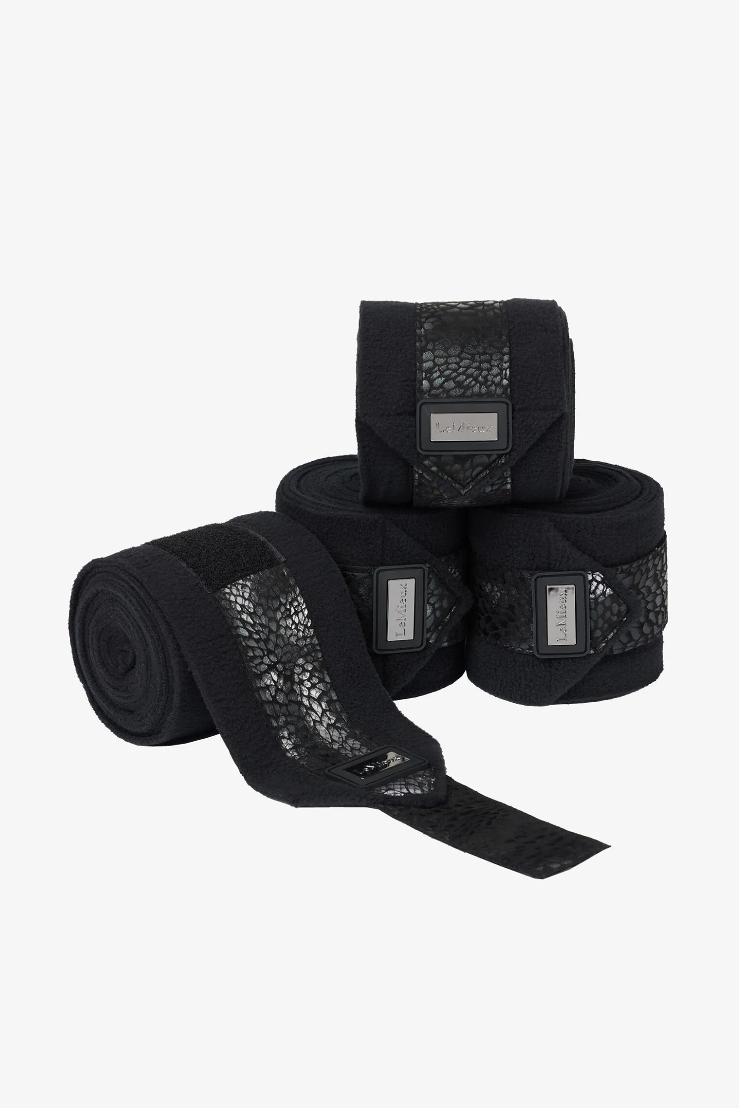De har en metallisk endedetaljfane med matchende metallisk trykk og merke, og de vil forbedre utseendet ditt samtidig som de gir hesten langvarig støtte mens du rir. Du kan bruke disse bandasjene alene eller med LeMieux underbandasjeputer for ekstra beskyttelse.