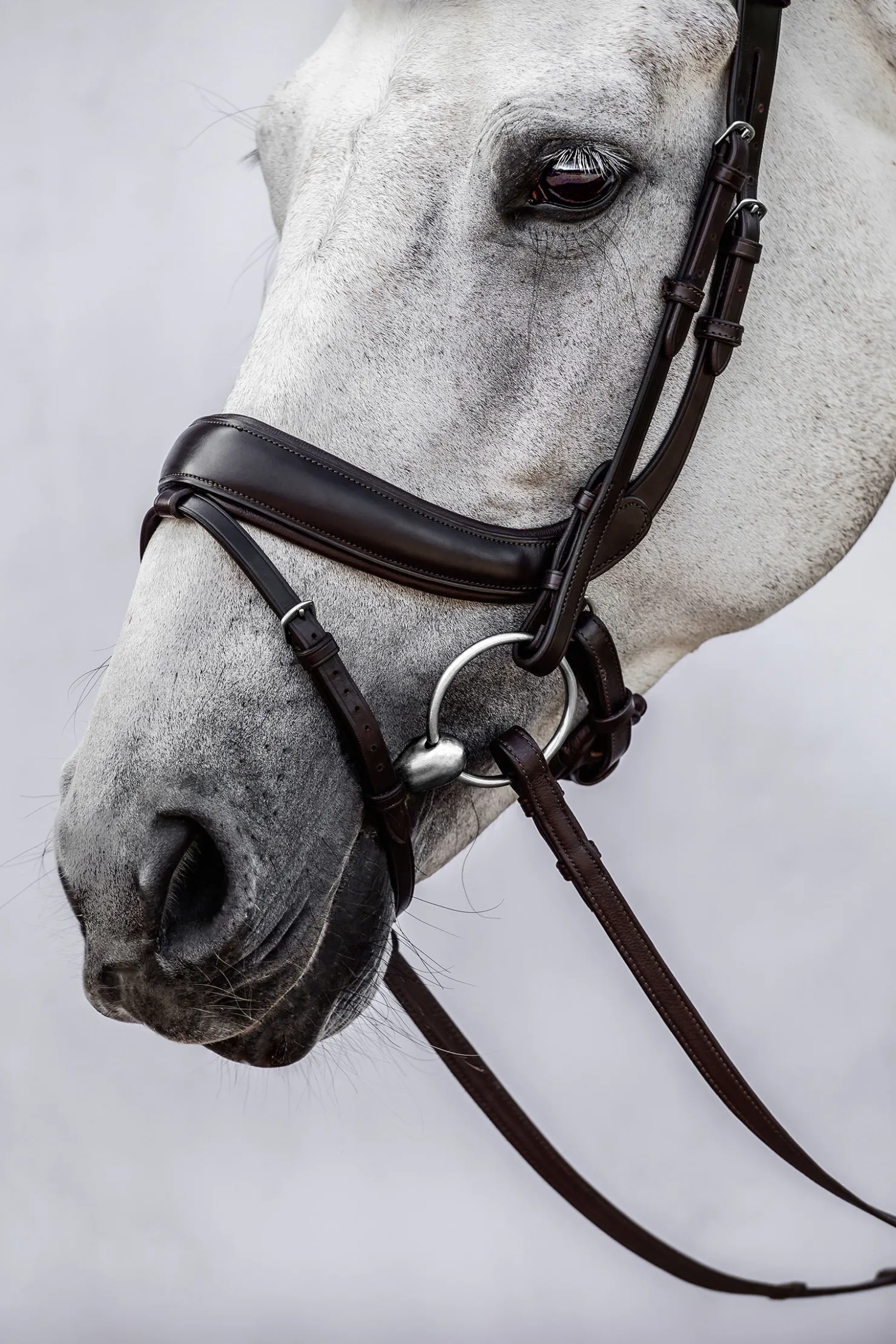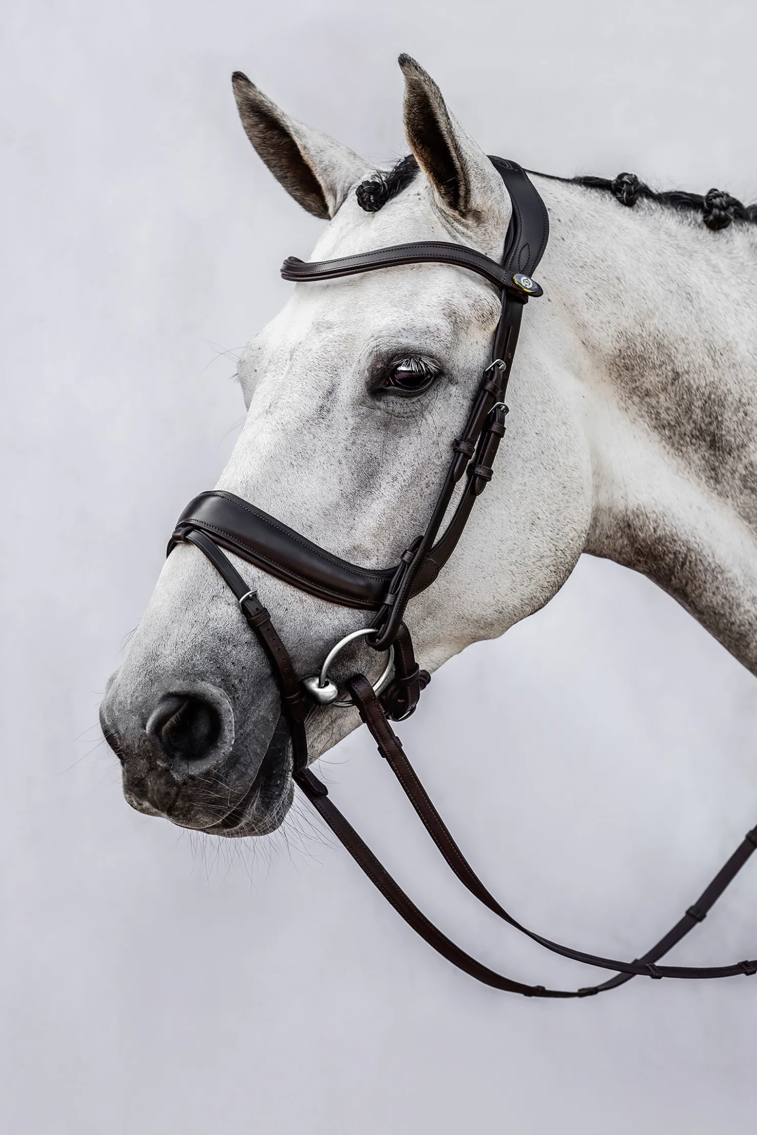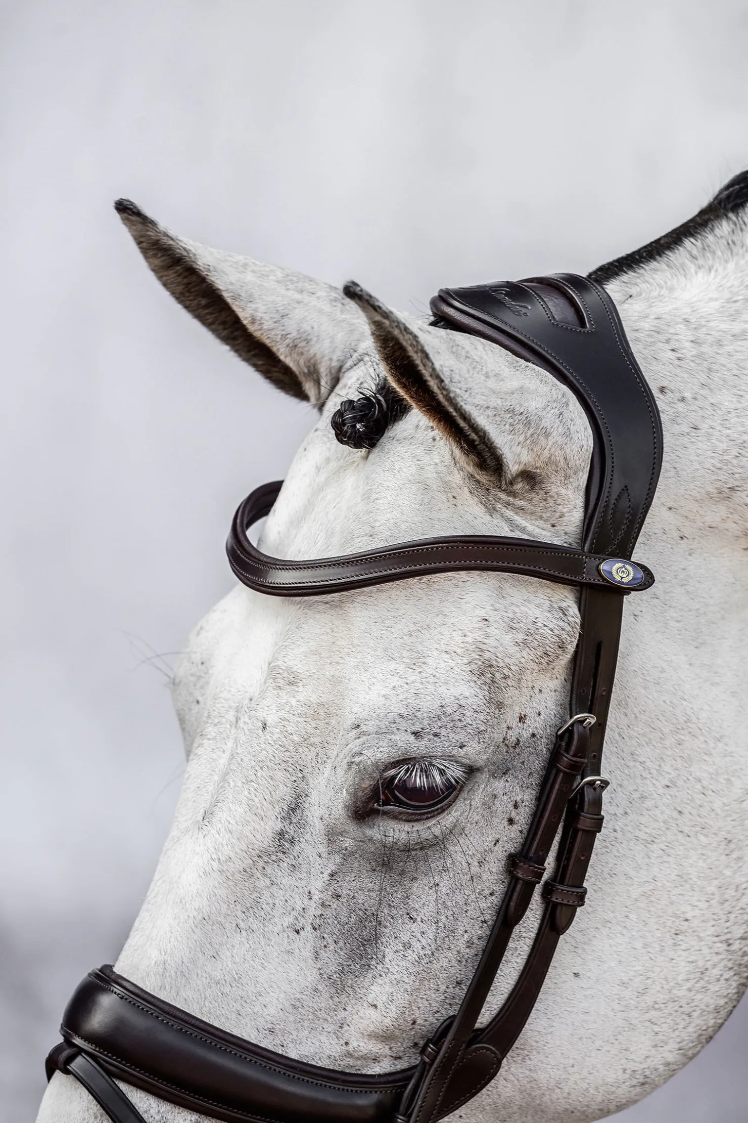 Dette hodelaget har et mer klassisk dressurdesign og er perfekt for en hest der du ønsker flere anatomiske funksjoner enn et vanlig engelsk neserem. Neseremmen er designet for å unngå trykk fra utsiden på tennene og de følsomme nervene. Den buede utformingen av neseremmen etterlater kinnbein og følsomme nerveender helt fri. Den øverste stroppen på neseremmen strammes med en trekk-lås, som sørger for at puten under alltid er sentrert for optimal trykkfordeling. Området rundt hestens nakke bak ørene er svært følsomt, med mange nerver og leddbånd. For å lette trykket fra hodelaget har vi utviklet et ekstra bredt nakke-stykke. Nakke-stykket har også et utsnitt på toppen, som fordeler trykket jevnt og ikke fokuserer på et enkelt punkt. Nakke-stykket er også formet for å gi plass til hestens ører 窶å gi best mulig komfort. Kinnstykkene er spesielt utformet for å redusere trykket fra nakken gjennom de elastiske Cradles™ånd der bittet skal hvile. Det elastiske båndet er delvis plassert i kinnstykkene ved bittet, men også på våre tøyler. Tanken er at de skal virke elastisk og gi høyere komfort for hesten, da de skal tillate bittet å 窶枅jære窶ære mildere og mer hestevennlig enn vanlige hodelag og tøyler. På dette hodelaget er sømmene avrundet, og det finnes også valgfri Cradles™ør det enkelt å koble av Cradles™åndet er U-formet for å forhindre trykk på hestens panne og øyehulen. I dag har alle pannebånd en gummibelagt innside, kalt 窶杪nti-slip窶åndet å holde seg på plass og forhindrer at det glir ned. Som om ikke det var nok, har de også den populære Click-It™ør det enkelt å fjerne og erstatte pannebåndet etter behov, selv når hesten bærer hodelaget. Hodelaget er godkjent for konkurranser i alle disipliner i Sverige og innen FEI. Husk å kjøpe en hake-rem og feste den til pannebåndet, og sørg for at Cradles™ært følsomme for trykk, har vanskeligheter med å slappe av og komme i arbeid, har vanskeligheter med å ta støtte på bittet, har tidligere hatt bitt- eller tannrelaterte skader eller noen ganger kan bli sterke. Merk: Kinnrem og tøyler er ikke inkludert og må kjøpes separat.