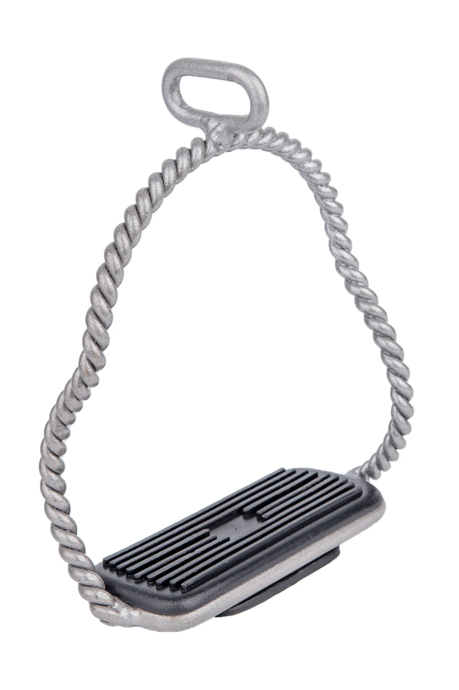 Stainless steel stirrups with eye at 90° and black rubber tread insert. The curved branches are in twisted stainless steel. Pair.