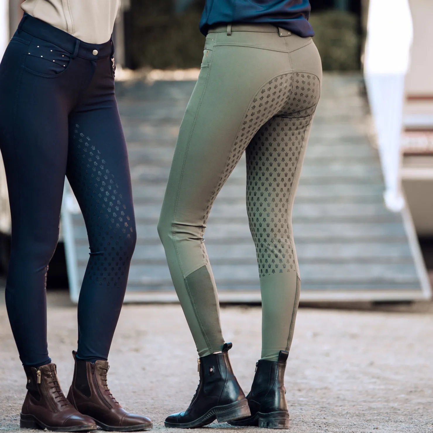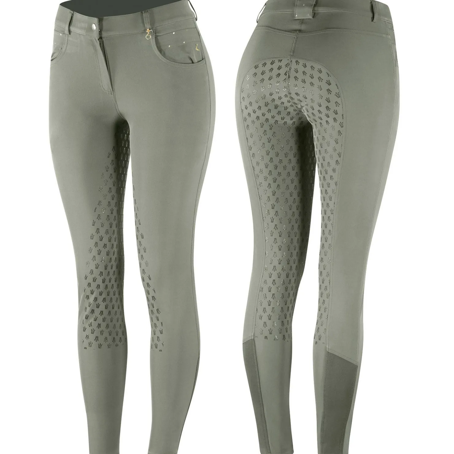 Horze Sienna helforsterket ridebukse med silikon til dame er nydelig og har masse trendy design, som bronseglitter på lommene og livet, og kronemotiv på silikontrykket, noe som hjelper med å holde deg i balanse og kontroll i salen. Frontlommene er ideelle for å ha med deg telefonen. Det fireveis stretch-stoffet er støttende og eksepsjonelt komfortabelt å bruke – perfekt for lange dager i stallen.