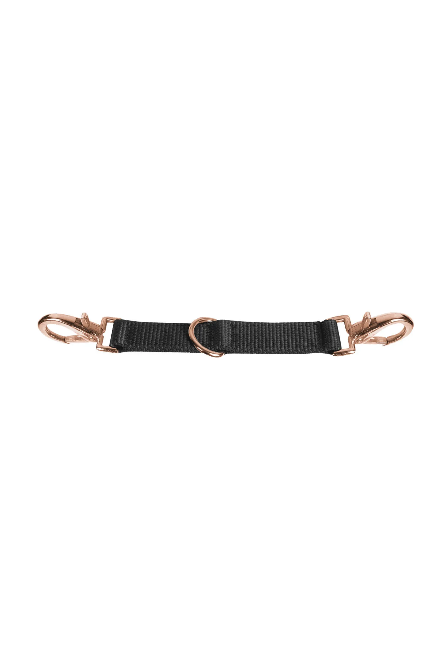 With two carabiners and central D-ring. With rose gold fittings.