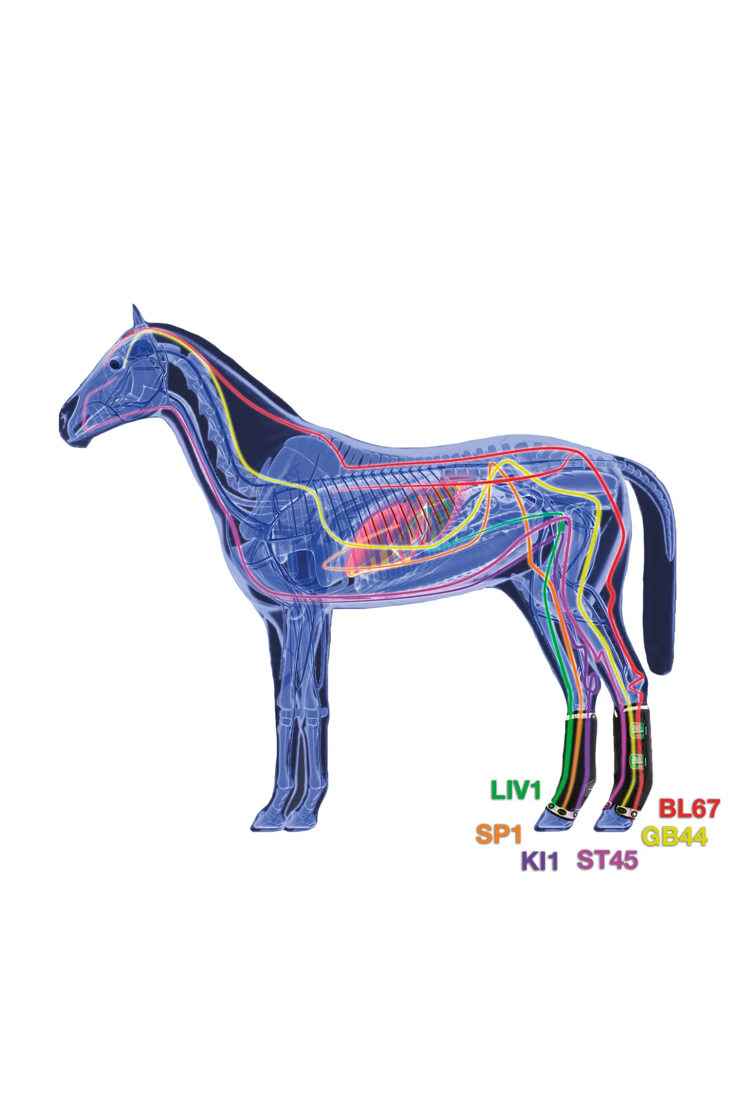 Det terapeutiske støttebelegget har 18 magnetiske enheter som bedrer cellulære funksjoner, de gir en naturlig terapeutisk støtte fra hoven til pipa og gir refleksologi til hele kroppen.Dette er et 2-i-1 produkt som er utviklet for å støtte leddbåndene og seneapparatet under transport, eller for å hindre hevelser etter trening. De er 100% italieske, med utskiftbar innside med COOLMAX (spesielle fibre som transporterer fuktighet mot den ytre overflaten av stoffet slik at huden holdes tørr). På utsiden, i nærheten av koden, er det en ekstra beskyttelse som reduserer slitasje på grunn av friksjon. Elastiske stropper med borrelås er tilpasset for å gi optimal støtte til senene, komfort og grep.Permanentmagneten som anvendes er sammensatt av et sterkt magnetisk legering av neodym, jern og bor med nikkelbelegg, og er i stand til å gi en magnetisk flukstetthet på 2600 Gauss hver.Plasseringen av magnetene, deres flukstetthet, intensitet og polarisering har blitt studert av veterinærer og proffe ryttere for å maksimere lokal økning av vaskulær blodstrøm og lymfatisk sirkulasjon, noe som gir flere fordelaktige effekter:Refleksologi effekter:Ved hjelp av refleksologiprinsipper, som er magnetisk stimulerende reflekspoeng (Ting) plassert på spesifikke meridianer hos hesten (de samme punktene som brukes for akupunktur), blir moderate rebalanseringseffekter oppnådd:Bakbeinsbelegg:Magneten ved Yang meridian LIV (Lever – Ting LIV 1), virker på kodene, på de overfladiske sidemusklene og på muskler i kryss og hofter.Magneten ved Yang meridian KI (Nyre – Ting Ki 1), virker på kodene, på bein og bak-senene.Magneten ved Yang meridian SP (Milt – Ting SP1), virker mot overdreven dannelse av leddvæske og har positive effekter på små og store psoas muskler.Magneten ved Yin meridian BL (blære – Ting BL67), virker på hoven.Magneten ved Yin meridian GB (galleblæren – Ting GB44), virker på hoven og på sidemusklene.Magneten i nærheten av Yin meridian (magen – Ting ST45) ST, virker mot problemer i muskler og kodene.